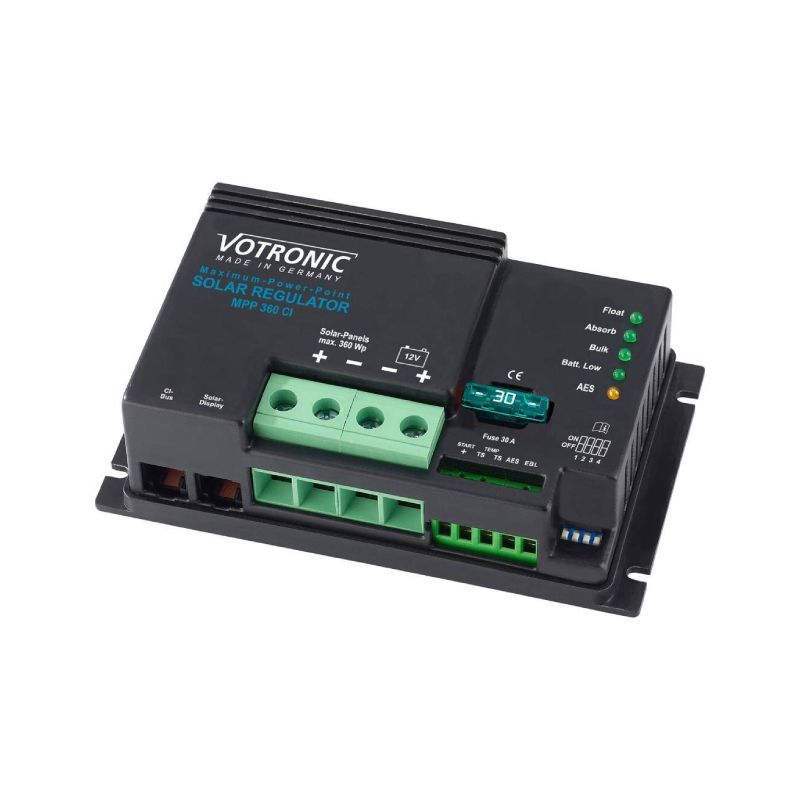 | Opis ogólny | Votronic MPPT 360 CI to regulator ładowania typu MPPT (Maximum Power Point Tracking) przeznaczony do systemów 12 V. Dzięki inteligentnemu śledzeniu punktu mocy maksymalnej i wysokiej sprawności, urządzenie zapewnia optymalne wykorzystanie energii pochodzącej z paneli fotowoltaicznych, nawet przy zmiennym nasłonecznieniu.